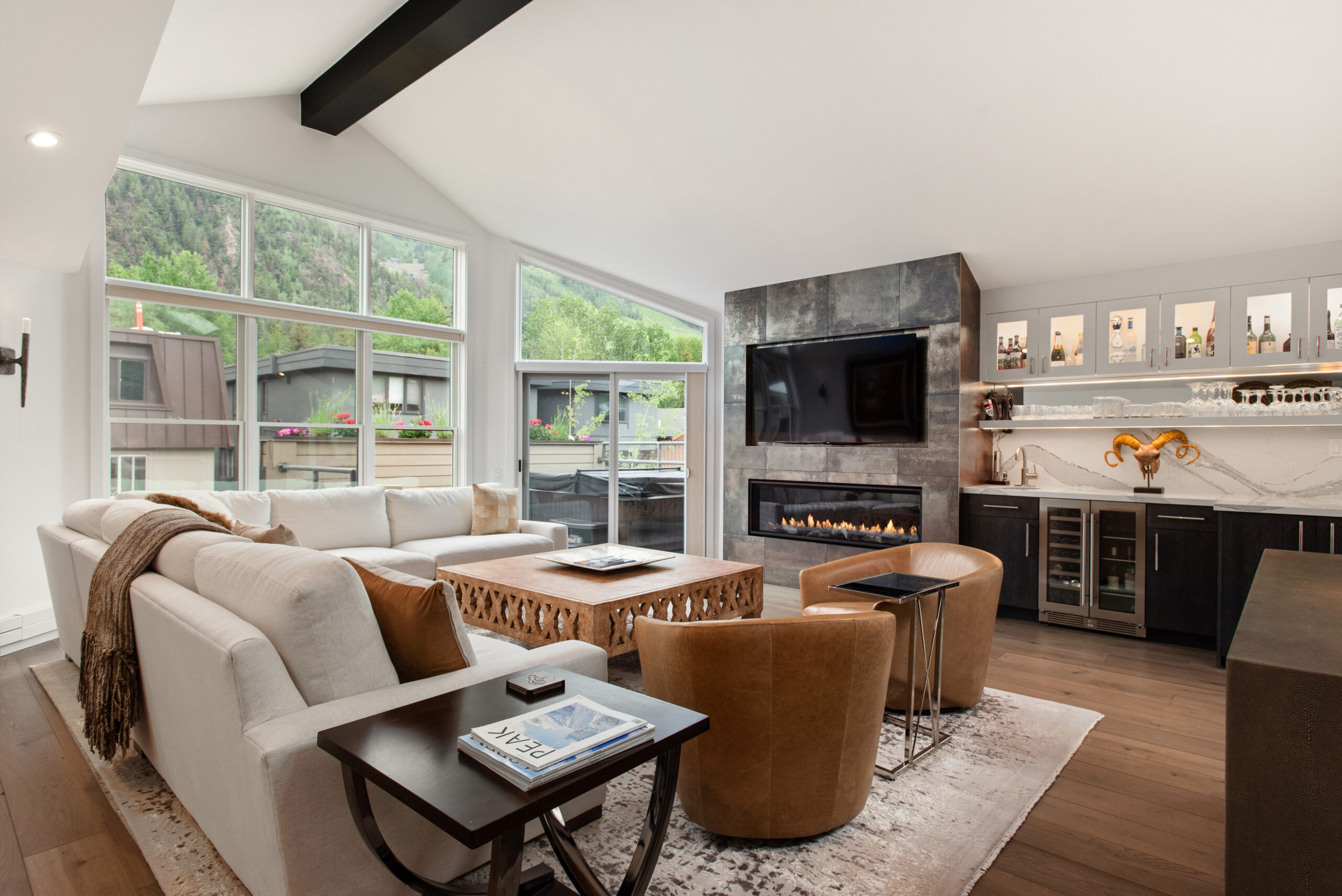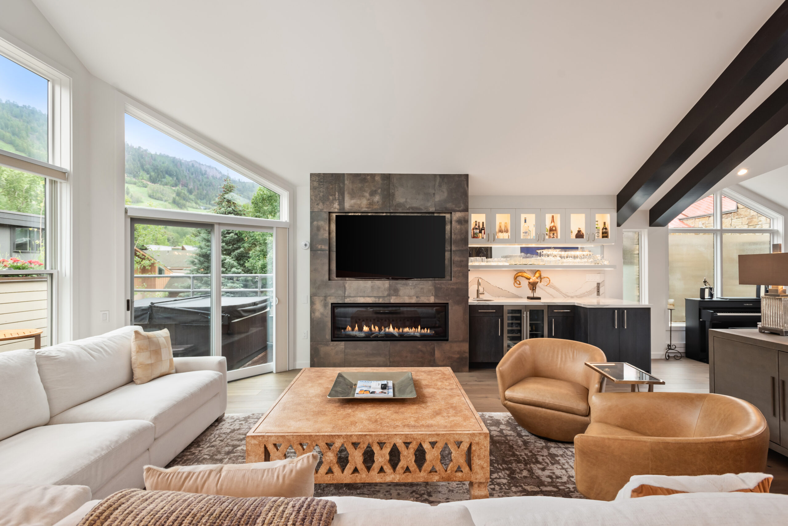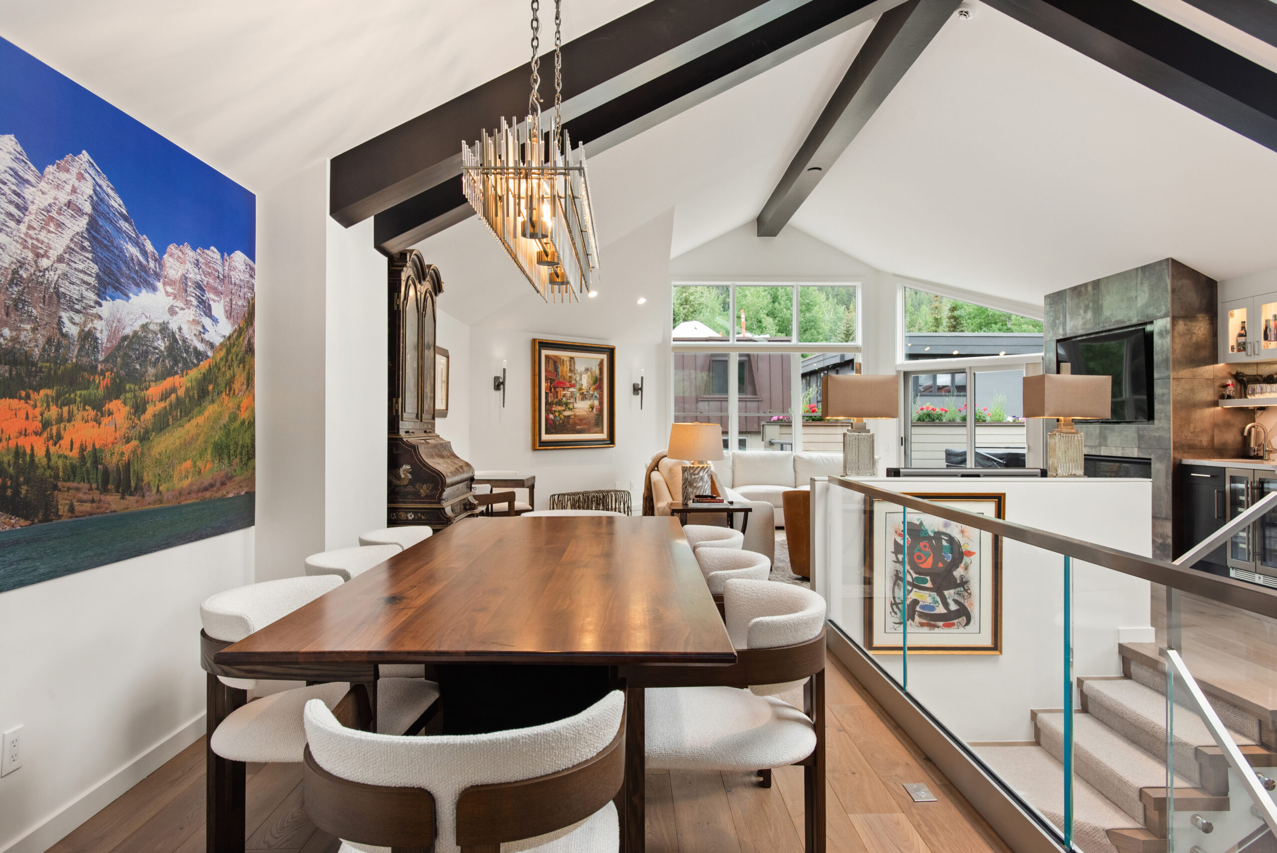 Experience the pinnacle of luxury in the core at Aspen’s Durant Mews. This exquisitely remodeled four-bedroom townhome offers unparalleled living space and ultimate convenience to both skiing and downtown Aspen. Situated on a serene street just two blocks from the Aspen Moutain Gondola, this prime location immerses you in Aspen’s vibrant lifestyle while providing a peaceful retreat. The bright and open living area features two distinct entertainment zones, an elegant new gas fireplace adjacent to a full wet bar, and breathtaking views of Aspen Mountain extending to the private deck. The gourmet kitchen, adorned with Caesarstone countertops and stainless steel appliances, includes a breakfast bar and an adjoining dining area with seating for eight. Additional seating adjacent to the kitchen area is bathed in light and offers exquisite views of Smuggler and Red Mountain. Boasting a unique floorplan within the luxurious Durant Mews complex, this townhome is both spacious and opulent. The top floor features a powder room discreetly tucked away and an additional deck for grilling. The expansive primary suite includes a gas fireplace, private balcony, spacious closets, and an elegant en suite bath with double vanities, steam shower, coffee bar and radiant heated floors. The townhome comfortably accommodates all guests with two master suites with king beds, a guest suite with a split king bed, and a bunk room with a twin-over-full bunk bed and an additional twin bed. Additional amenities include front and back private decks with a hot tub and grill, a laundry room with washer and dryer, air conditioning, and a three-car garage. The third garage bay is currently configured as a private owner’s closet with custom storage cabinetry and wine storage, making it easy for owners to store personal items while generating fabulous rental income. The recent renovation showcases spectacular features such as cathedral ceilings with custom beams, intricate woodwork, new skylights, and a custom gourmet kitchen with state-of-the-art appliances. A completely new custom glass stairwell floods the entry with natural light, and a new AC split system on the main floor and in the master suite ensures comfort. Beautifully renovated interiors throughout enhance the luxurious feel. For the discerning buyer seeking luxury and convenience, this townhome not only offers a serene location but also one of the most spacious and well-designed floorplans available under $20 million.