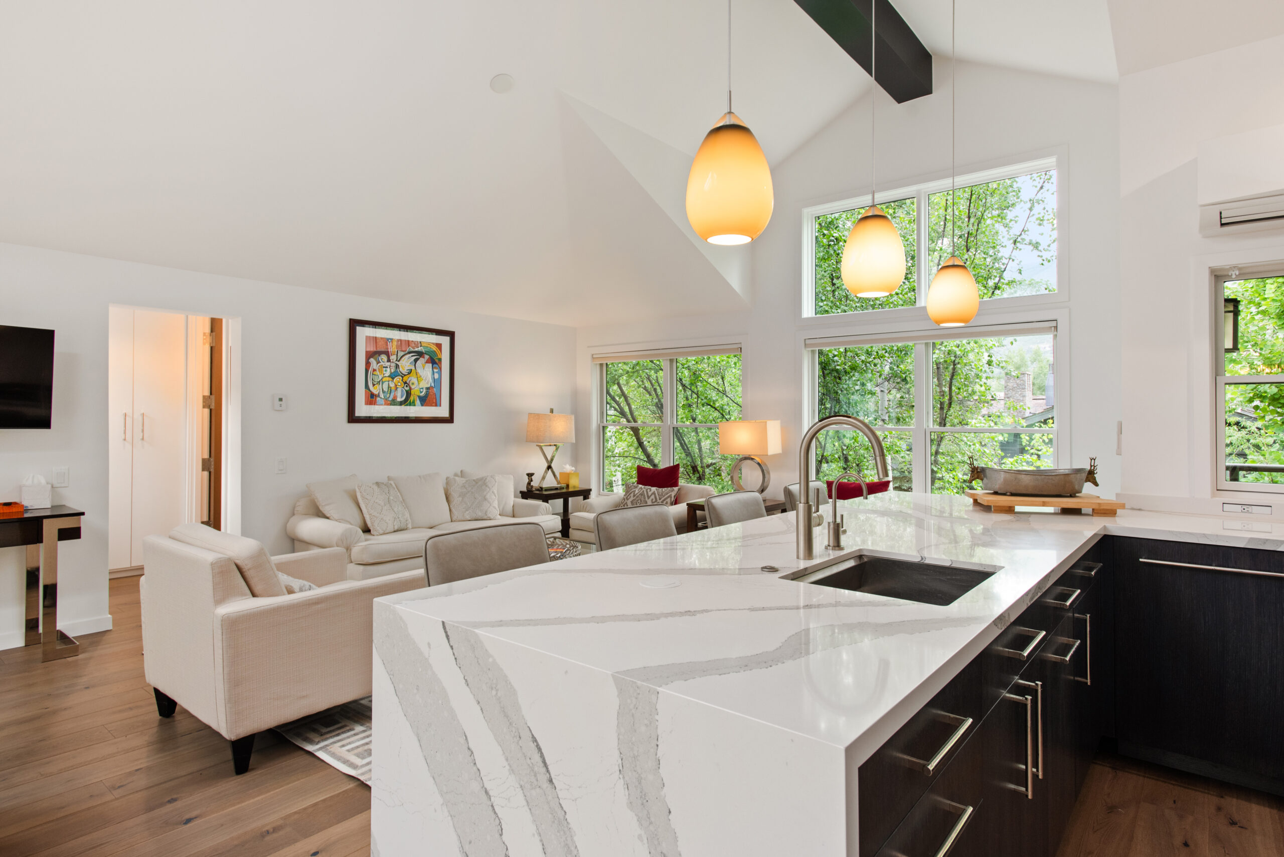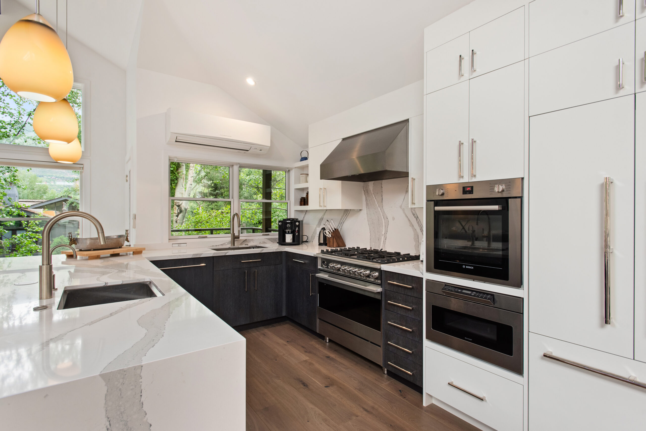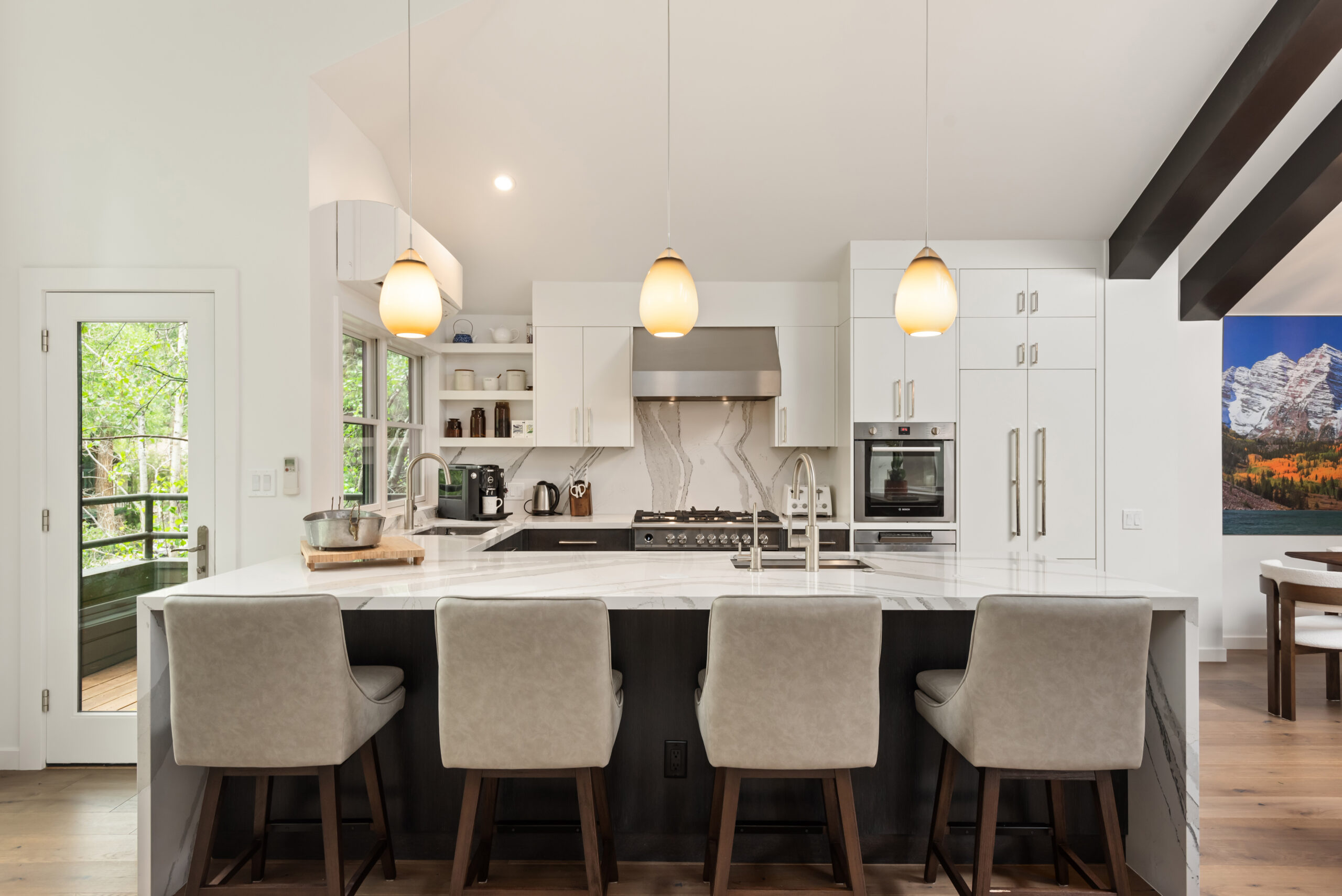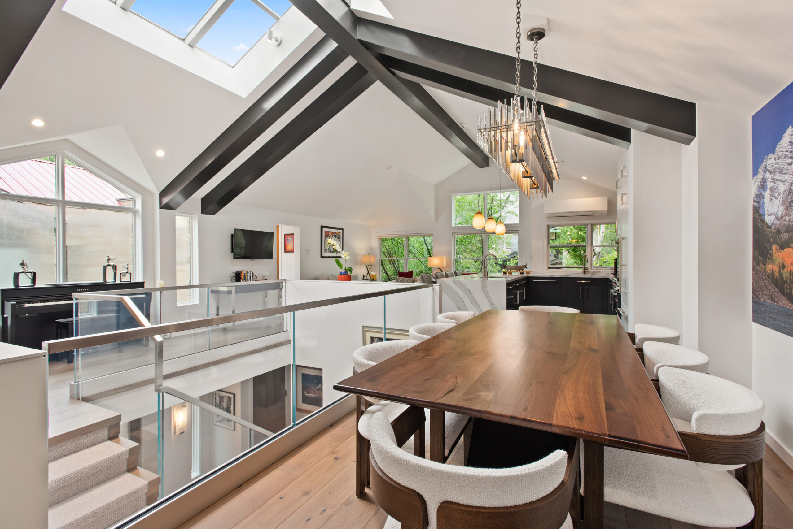 Experience the pinnacle of luxury in the core at Aspen’s Durant Mews. This exquisitely remodeled four-bedroom townhome offers unparalleled living space and ultimate convenience to both skiing and downtown Aspen. Situated on a serene street just two blocks from the Aspen Moutain Gondola, this prime location immerses you in Aspen’s vibrant lifestyle while providing a peaceful retreat. The bright and open living area features two distinct entertainment zones, an elegant new gas fireplace adjacent to a full wet bar, and breathtaking views of Aspen Mountain extending to the private deck. The gourmet kitchen, adorned with Caesarstone countertops and stainless steel appliances, includes a breakfast bar and an adjoining dining area with seating for eight. Additional seating adjacent to the kitchen area is bathed in light and offers exquisite views of Smuggler and Red Mountain. Boasting a unique floorplan within the luxurious Durant Mews complex, this townhome is both spacious and opulent. The top floor features a powder room discreetly tucked away and an additional deck for grilling. The expansive primary suite includes a gas fireplace, private balcony, spacious closets, and an elegant en suite bath with double vanities, steam shower, coffee bar and radiant heated floors. The townhome comfortably accommodates all guests with two master suites with king beds, a guest suite with a split king bed, and a bunk room with a twin-over-full bunk bed and an additional twin bed. Additional amenities include front and back private decks with a hot tub and grill, a laundry room with washer and dryer, air conditioning, and a three-car garage. The third garage bay is currently configured as a private owner’s closet with custom storage cabinetry and wine storage, making it easy for owners to store personal items while generating fabulous rental income. The recent renovation showcases spectacular features such as cathedral ceilings with custom beams, intricate woodwork, new skylights, and a custom gourmet kitchen with state-of-the-art appliances. A completely new custom glass stairwell floods the entry with natural light, and a new AC split system on the main floor and in the master suite ensures comfort. Beautifully renovated interiors throughout enhance the luxurious feel. For the discerning buyer seeking luxury and convenience, this townhome not only offers a serene location but also one of the most spacious and well-designed floorplans available under $20 million.