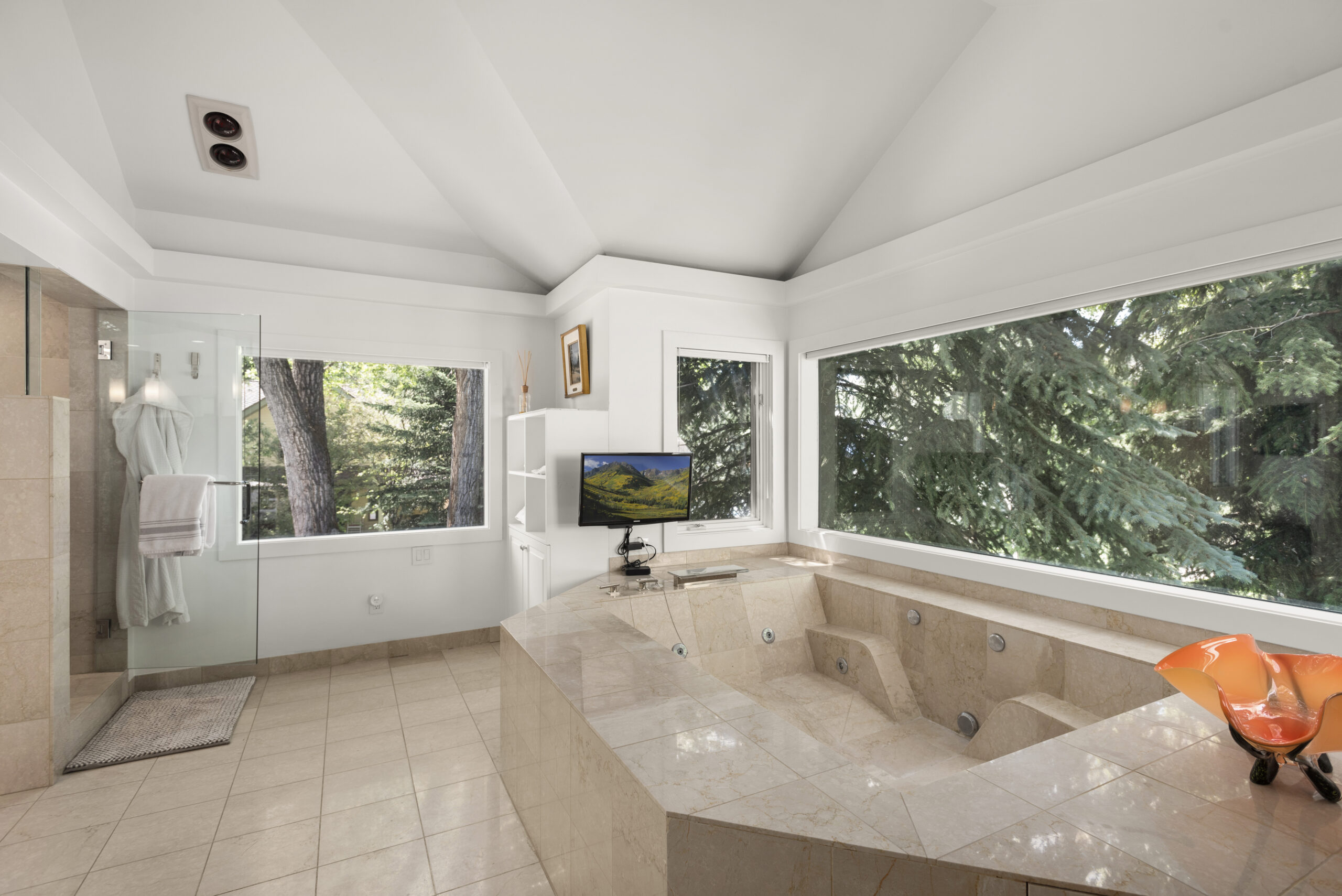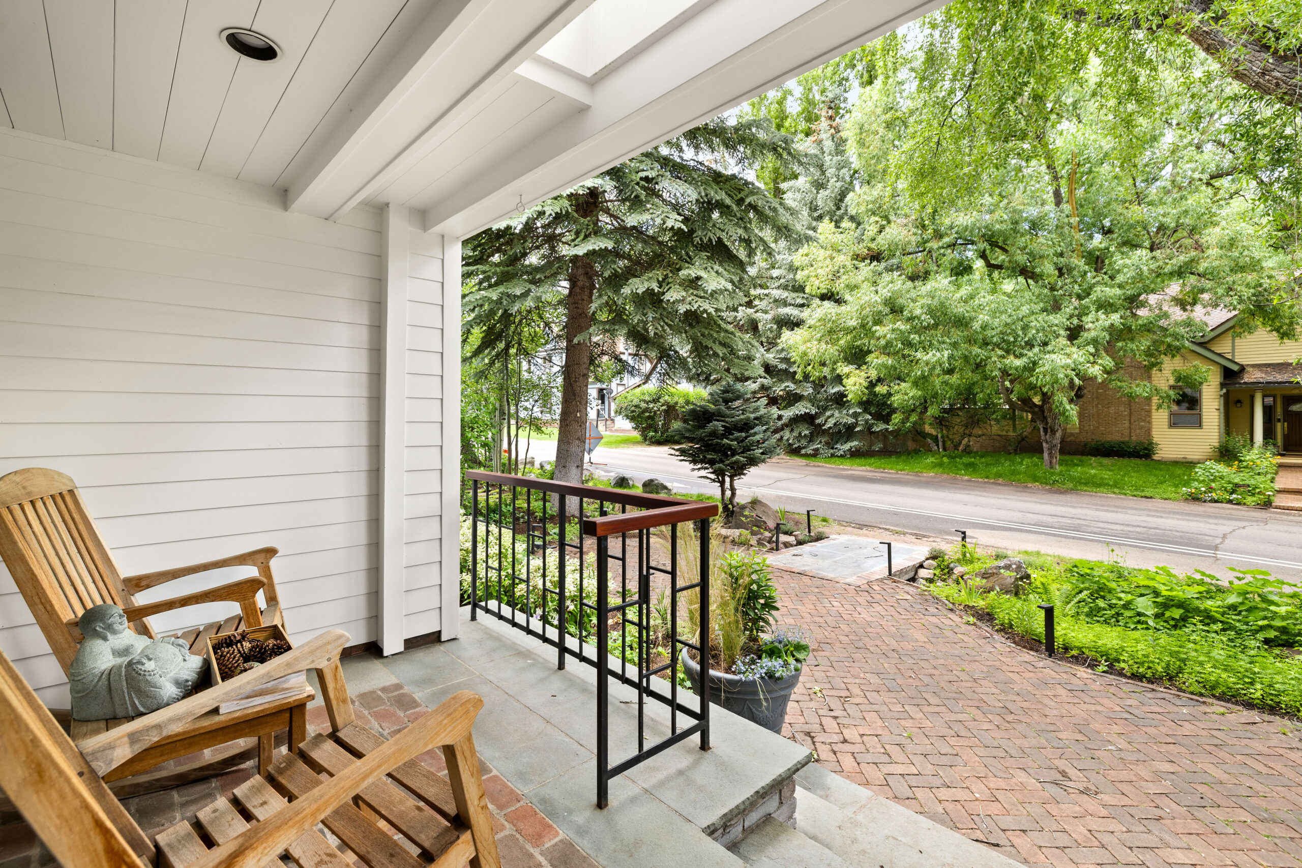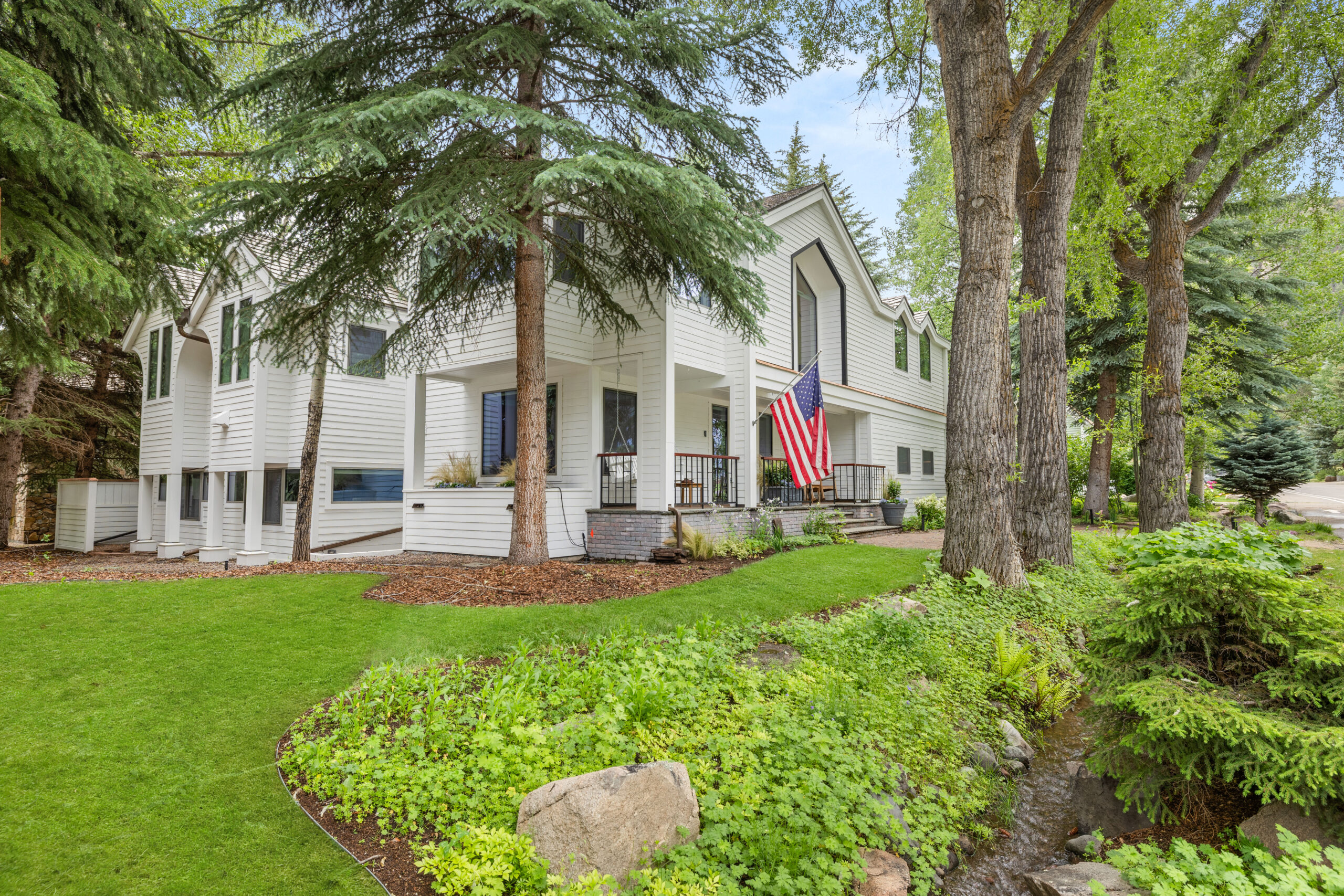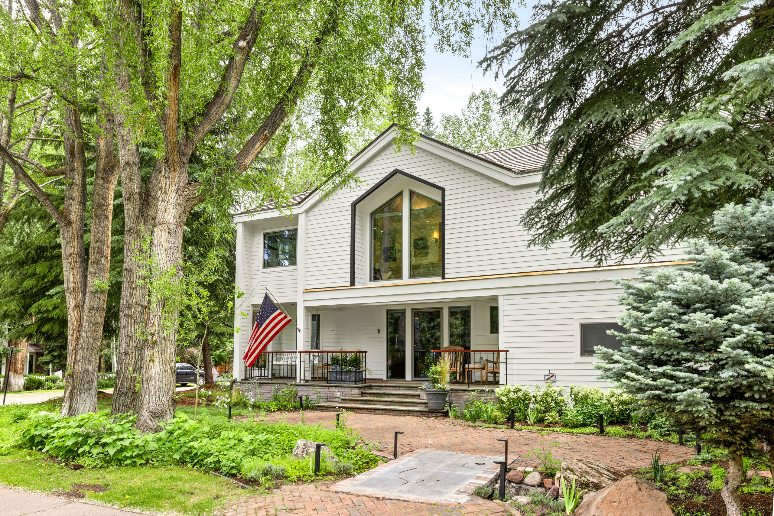 This newly renovated gem sits on a generous corner lot in Aspen’s coveted and tranquil West End neighborhood. Thoughtfully redesigned to embrace indoor-outdoor living, the light-filled main level features soaring vaulted timber ceilings, a wood-burning fireplace, and floor-to-ceiling slider doors that open to sun-drenched patios. The brand new gourmet kitchen includes Caesarstone countertops, custom cabinetry, and top-of-the-line appliances, seamlessly connecting to the open dining and living areas—ideal for entertaining and everyday comfort. Central A/C keeps the main level comfortable year-round, while expansive windows frame stunning views of Aspen and Shadow Mountain. The outdoor spaces are truly remarkable, with multiple gathering areas, a large patio for dining and grilling, a fire pit, and a recirculating stream set among mature Aspen trees and vibrant perennial gardens. The home’s southern exposure ensures sunshine throughout the day, a rare advantage in the West End. Just a few steps above the main living area, the elevated primary suite enjoys privacy and views of the landscaped patio below. It includes a gas fireplace, its own sunny balcony, and a luxurious spa-style bathroom with a jetted soaking tub, walk-in shower, and dual marble vanities surrounded by wraparound windows. Unlike most homes in the area, this residence is entirely above grade, allowing even the lower-level guest suites to enjoy garden views and direct access to the backyard and hot tub. Additional features include generous owner storage, cedar-lined closets, a large crawlspace, and a beautifully appointed main-level office with floor-to-ceiling windows facing the quiet corner lot. This special property also offers a private bike path out front, preventing overflow parking from the nearby Music Tent and preserving the home’s peaceful atmosphere. The front yard is nourished all summer long by the flowing Salvation Ditch, enhancing the lush gardens. With potential to expand by adding a subterranean level and a unique alley configuration that allows for four additional parking spaces beyond the two-car garage, this rare West End offering combines timeless design, exceptional light, and future flexibility. A true Aspen treasure not to be missed.