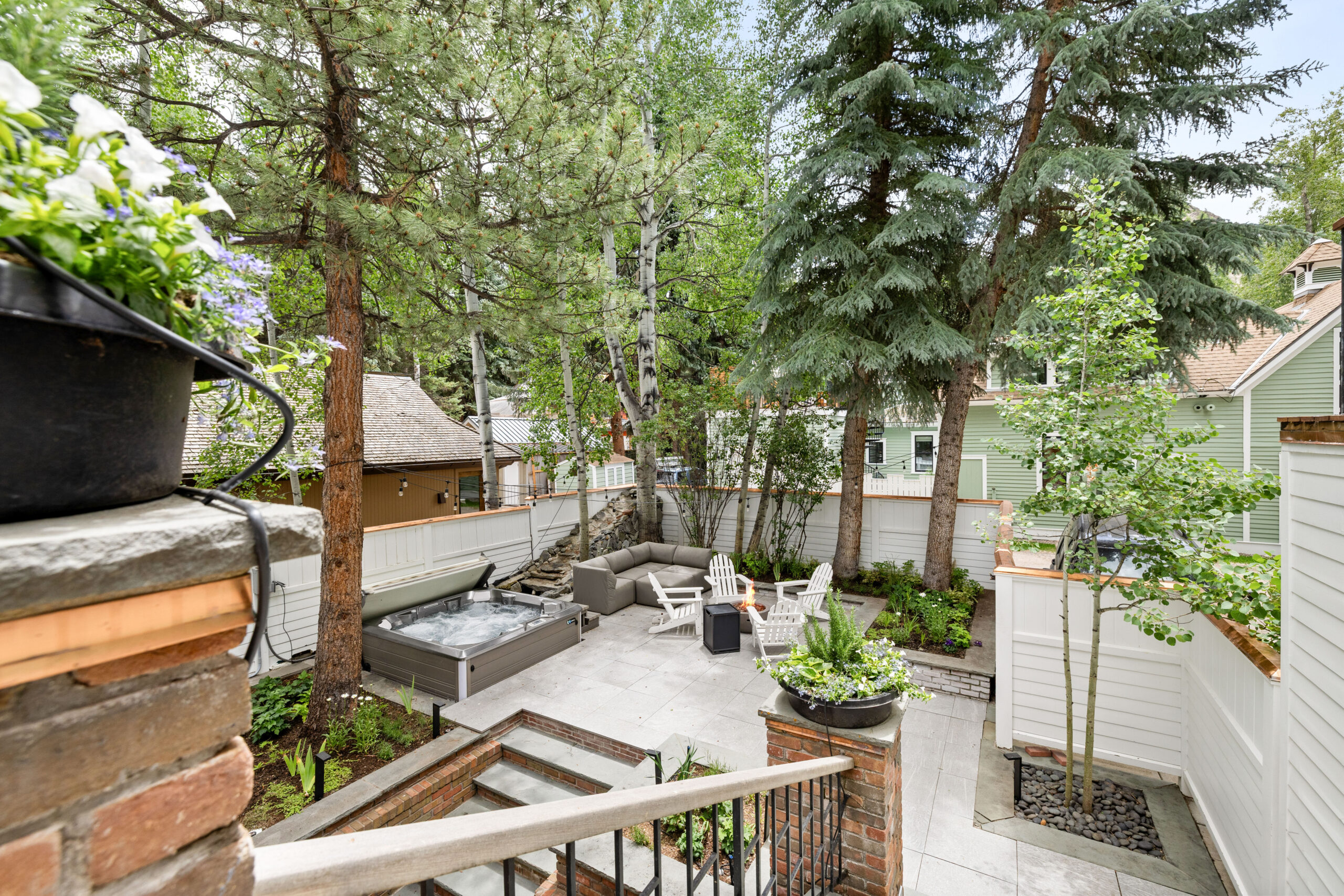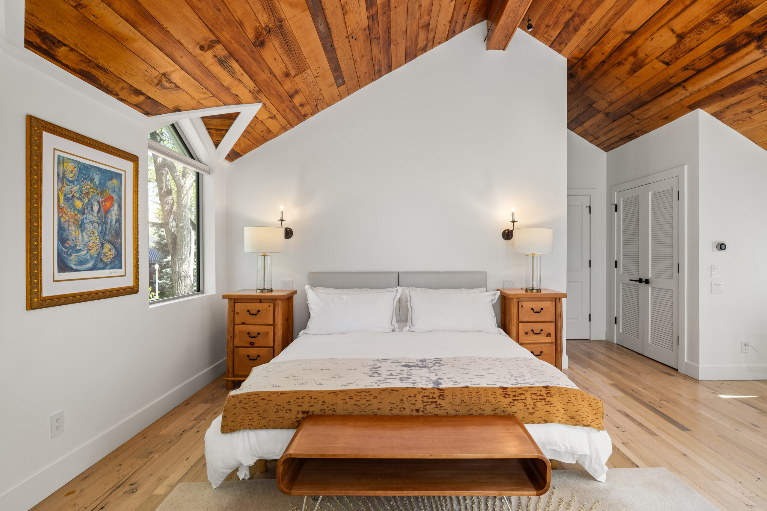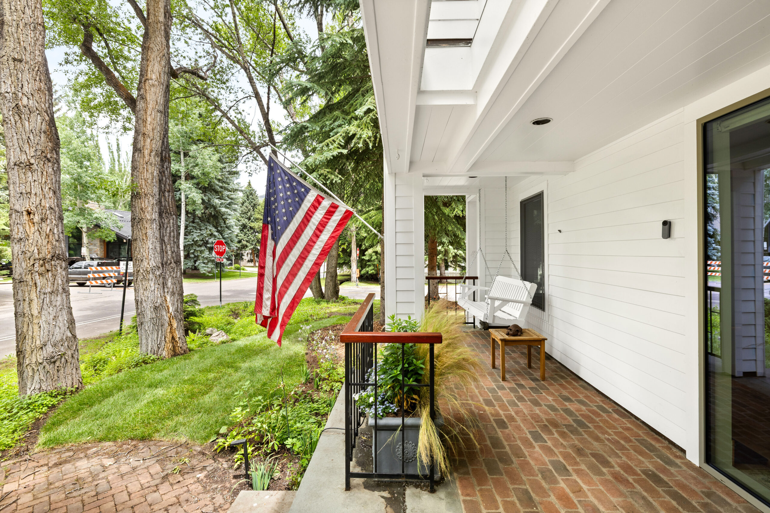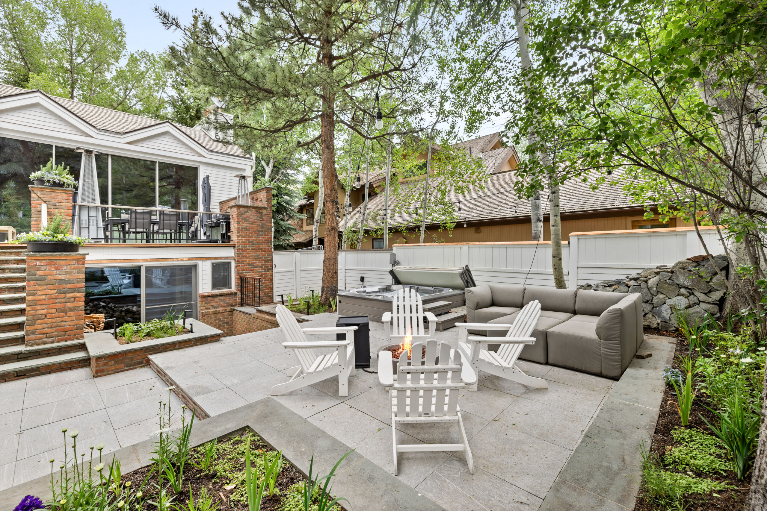 This newly renovated gem sits on a generous corner lot in Aspen’s coveted and tranquil West End neighborhood. Thoughtfully redesigned to embrace indoor-outdoor living, the light-filled main level features soaring vaulted timber ceilings, a wood-burning fireplace, and floor-to-ceiling slider doors that open to sun-drenched patios. The brand new gourmet kitchen includes Caesarstone countertops, custom cabinetry, and top-of-the-line appliances, seamlessly connecting to the open dining and living areas—ideal for entertaining and everyday comfort. Central A/C keeps the main level comfortable year-round, while expansive windows frame stunning views of Aspen and Shadow Mountain. The outdoor spaces are truly remarkable, with multiple gathering areas, a large patio for dining and grilling, a fire pit, and a recirculating stream set among mature Aspen trees and vibrant perennial gardens. The home’s southern exposure ensures sunshine throughout the day, a rare advantage in the West End. Just a few steps above the main living area, the elevated primary suite enjoys privacy and views of the landscaped patio below. It includes a gas fireplace, its own sunny balcony, and a luxurious spa-style bathroom with a jetted soaking tub, walk-in shower, and dual marble vanities surrounded by wraparound windows. Unlike most homes in the area, this residence is entirely above grade, allowing even the lower-level guest suites to enjoy garden views and direct access to the backyard and hot tub. Additional features include generous owner storage, cedar-lined closets, a large crawlspace, and a beautifully appointed main-level office with floor-to-ceiling windows facing the quiet corner lot. This special property also offers a private bike path out front, preventing overflow parking from the nearby Music Tent and preserving the home’s peaceful atmosphere. The front yard is nourished all summer long by the flowing Salvation Ditch, enhancing the lush gardens. With potential to expand by adding a subterranean level and a unique alley configuration that allows for four additional parking spaces beyond the two-car garage, this rare West End offering combines timeless design, exceptional light, and future flexibility. A true Aspen treasure not to be missed.