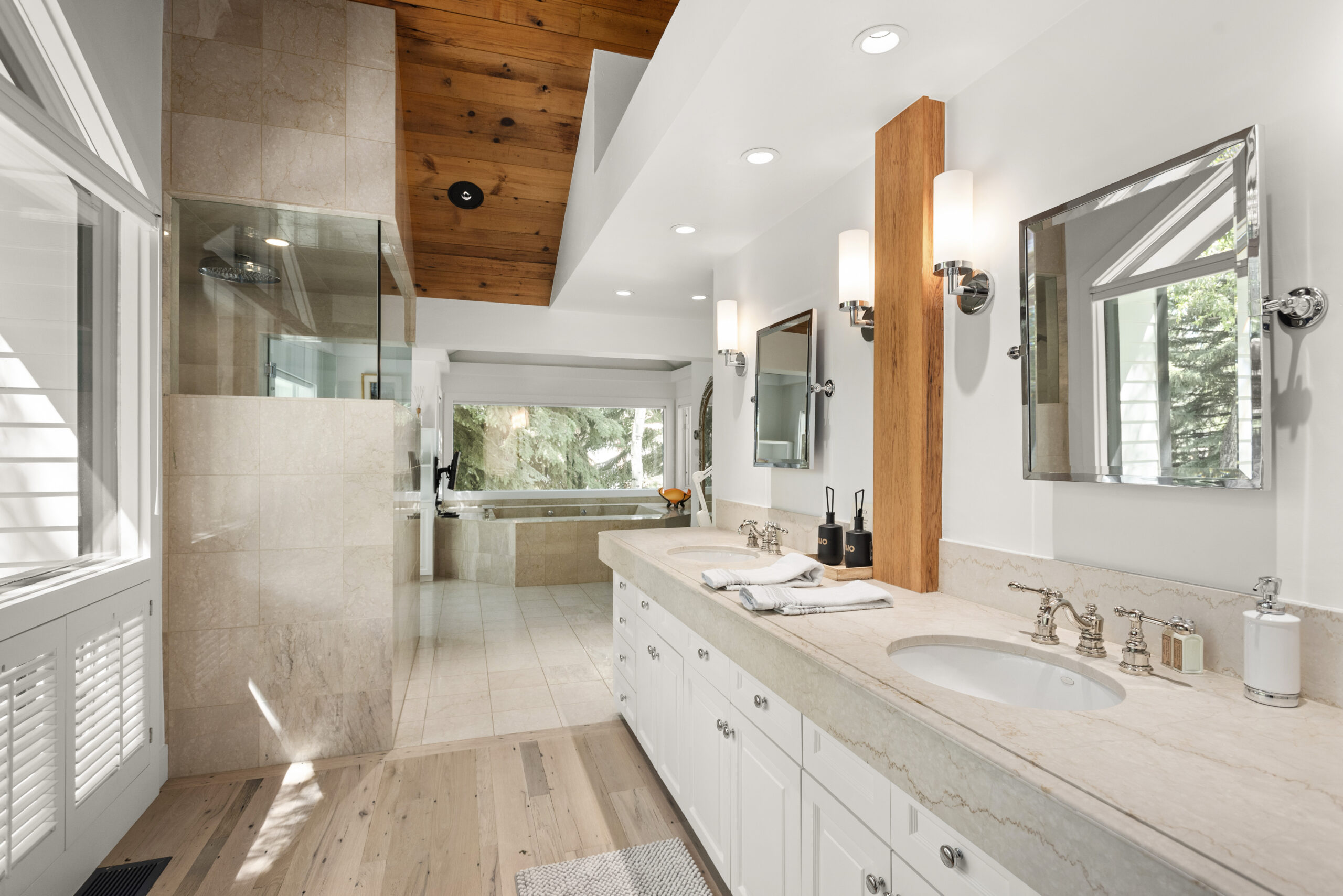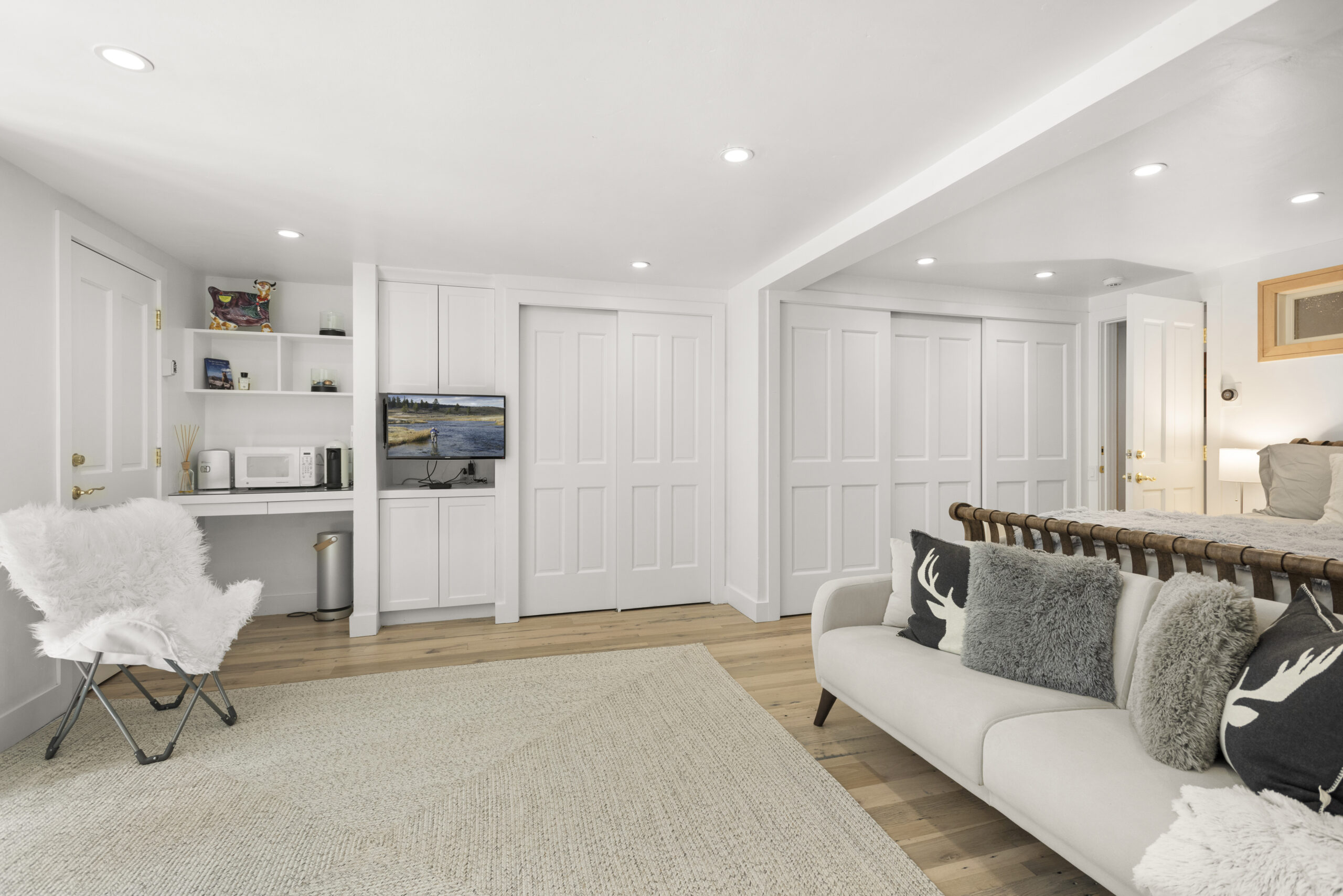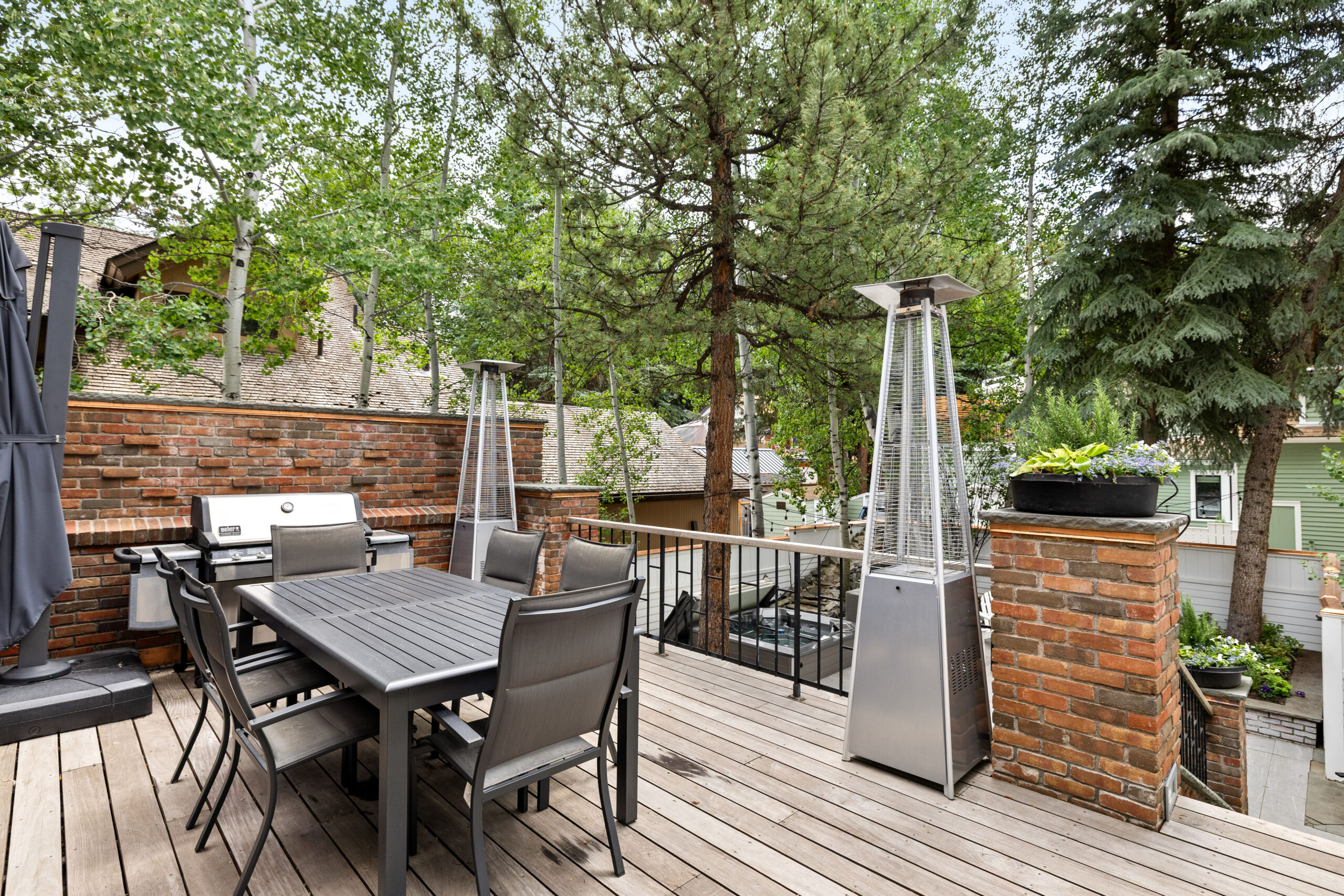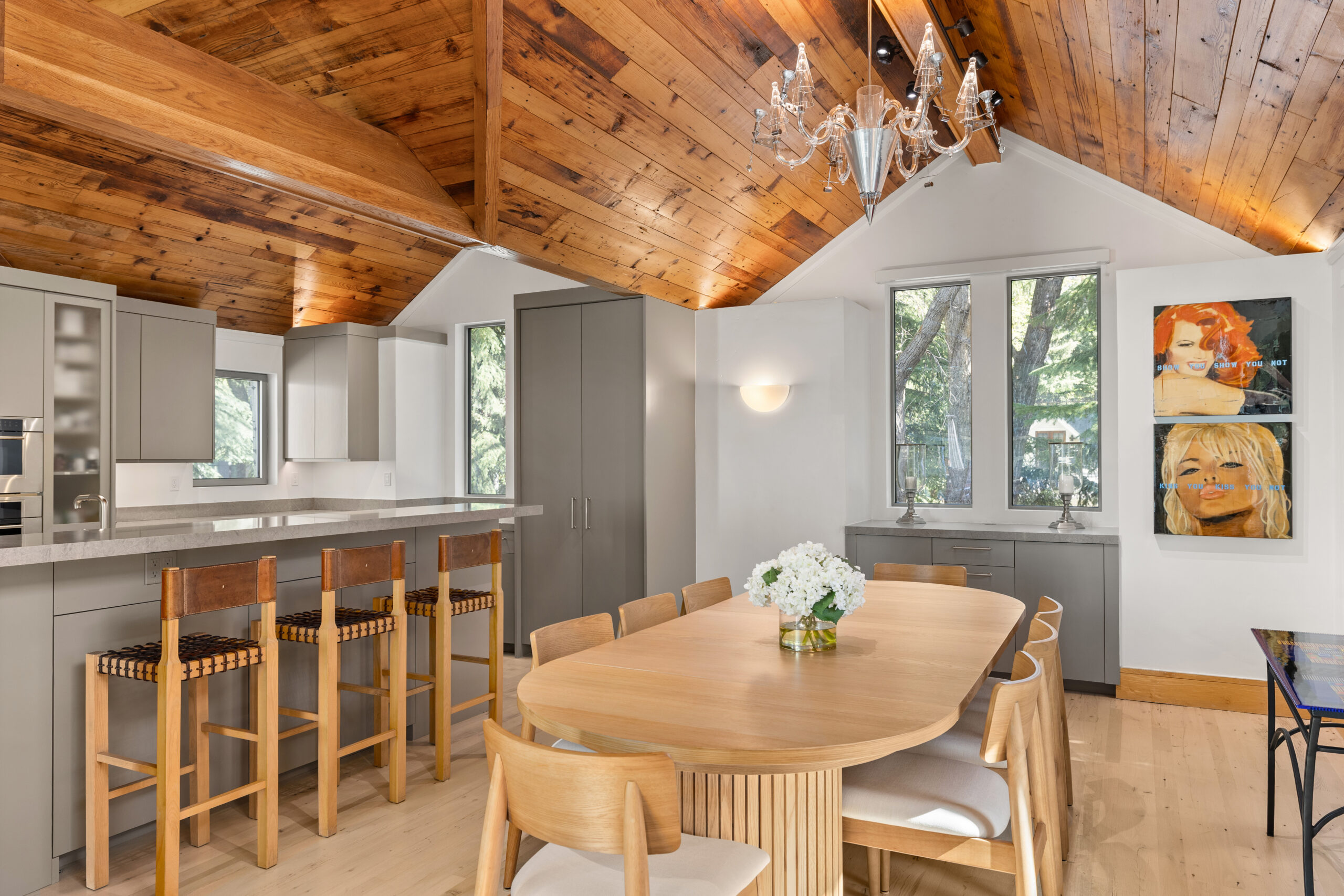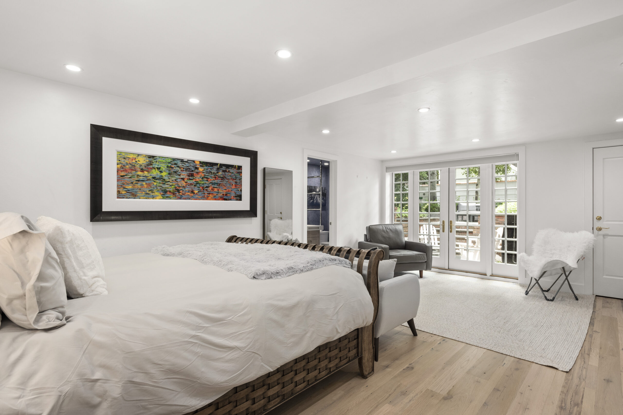 This newly renovated gem sits on a generous corner lot in Aspen’s coveted and tranquil West End neighborhood. Thoughtfully redesigned to embrace indoor-outdoor living, the light-filled main level features soaring vaulted timber ceilings, a wood-burning fireplace, and floor-to-ceiling slider doors that open to sun-drenched patios. The brand new gourmet kitchen includes Caesarstone countertops, custom cabinetry, and top-of-the-line appliances, seamlessly connecting to the open dining and living areas—ideal for entertaining and everyday comfort. Central A/C keeps the main level comfortable year-round, while expansive windows frame stunning views of Aspen and Shadow Mountain. The outdoor spaces are truly remarkable, with multiple gathering areas, a large patio for dining and grilling, a fire pit, and a recirculating stream set among mature Aspen trees and vibrant perennial gardens. The home’s southern exposure ensures sunshine throughout the day, a rare advantage in the West End. Just a few steps above the main living area, the elevated primary suite enjoys privacy and views of the landscaped patio below. It includes a gas fireplace, its own sunny balcony, and a luxurious spa-style bathroom with a jetted soaking tub, walk-in shower, and dual marble vanities surrounded by wraparound windows. Unlike most homes in the area, this residence is entirely above grade, allowing even the lower-level guest suites to enjoy garden views and direct access to the backyard and hot tub. Additional features include generous owner storage, cedar-lined closets, a large crawlspace, and a beautifully appointed main-level office with floor-to-ceiling windows facing the quiet corner lot. This special property also offers a private bike path out front, preventing overflow parking from the nearby Music Tent and preserving the home’s peaceful atmosphere. The front yard is nourished all summer long by the flowing Salvation Ditch, enhancing the lush gardens. With potential to expand by adding a subterranean level and a unique alley configuration that allows for four additional parking spaces beyond the two-car garage, this rare West End offering combines timeless design, exceptional light, and future flexibility. A true Aspen treasure not to be missed.