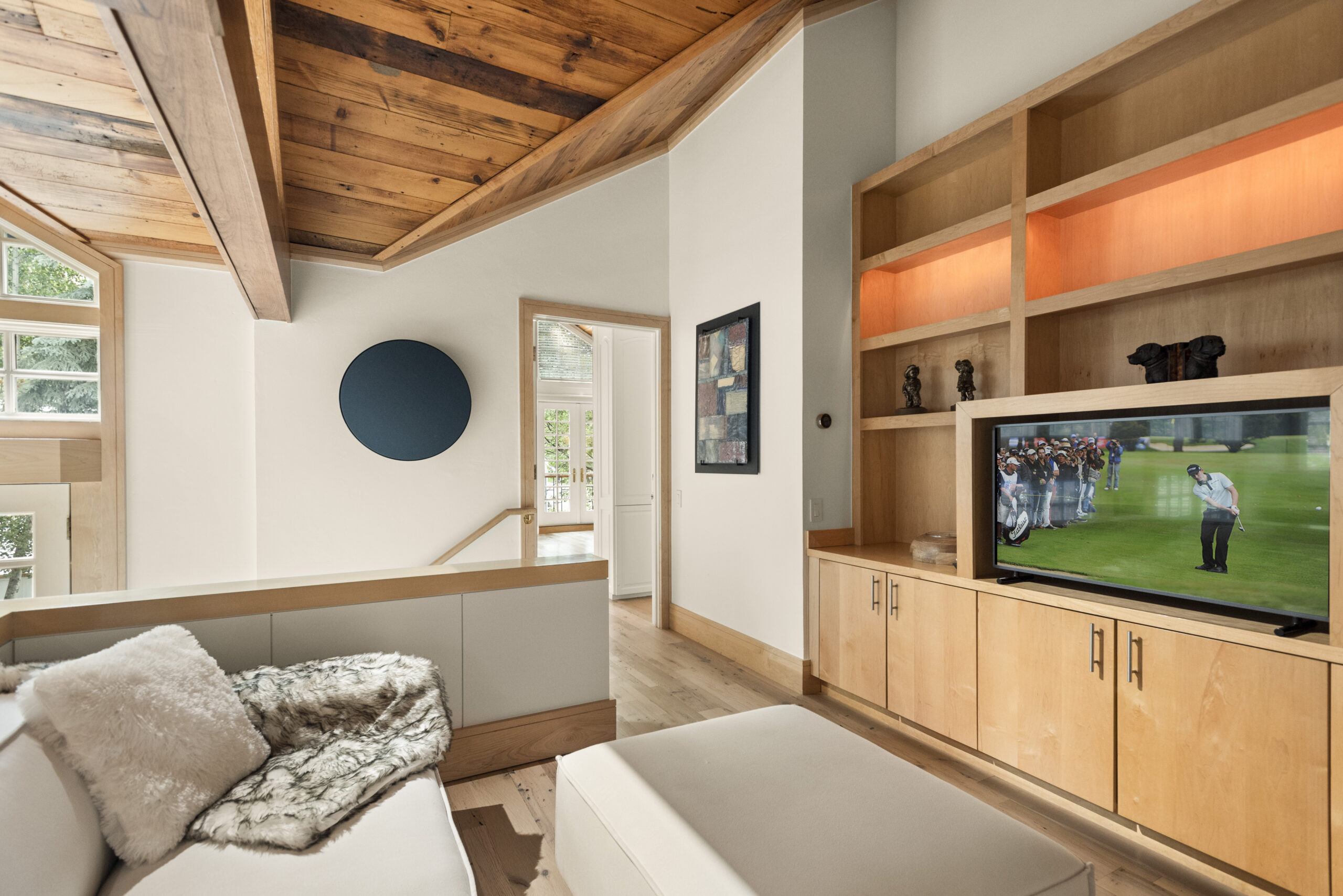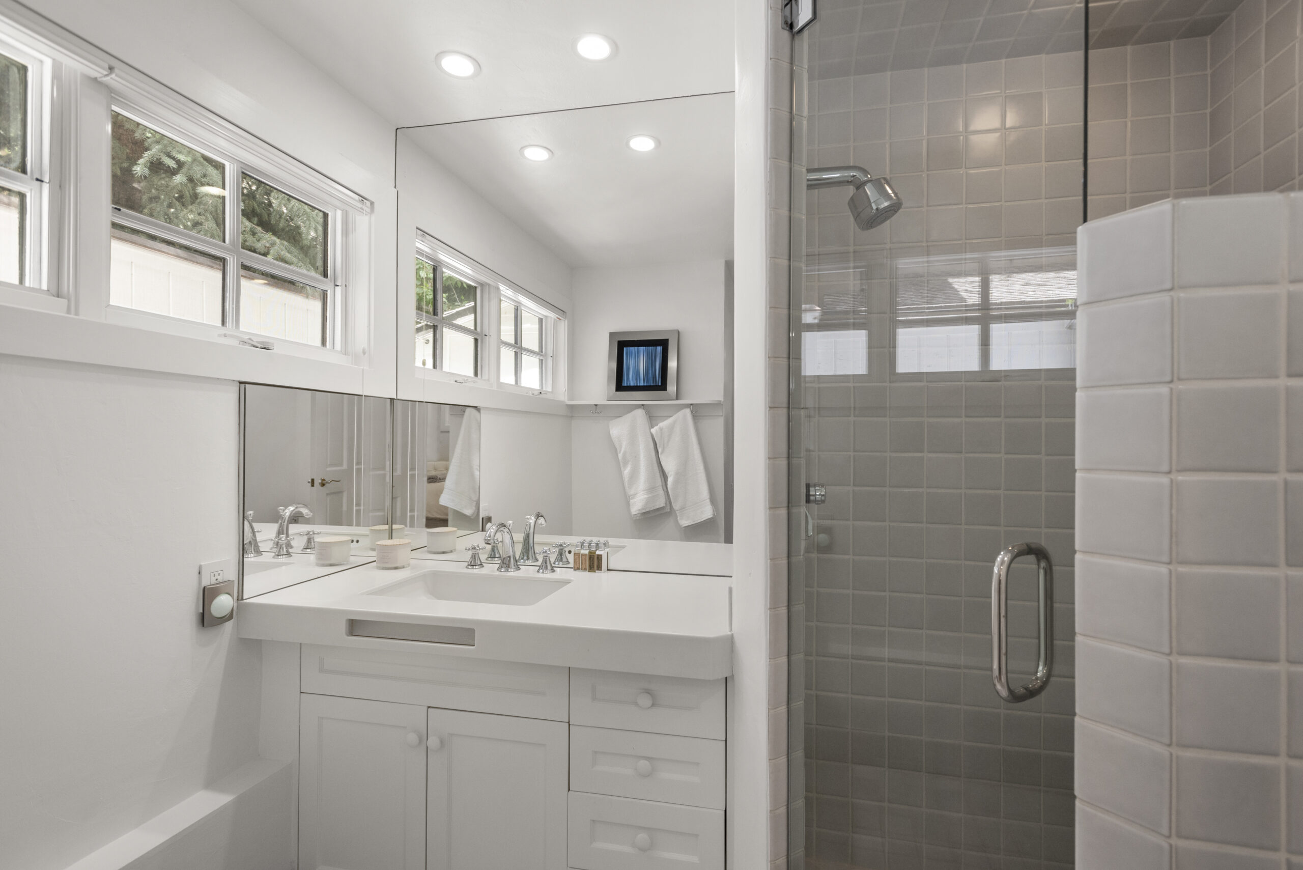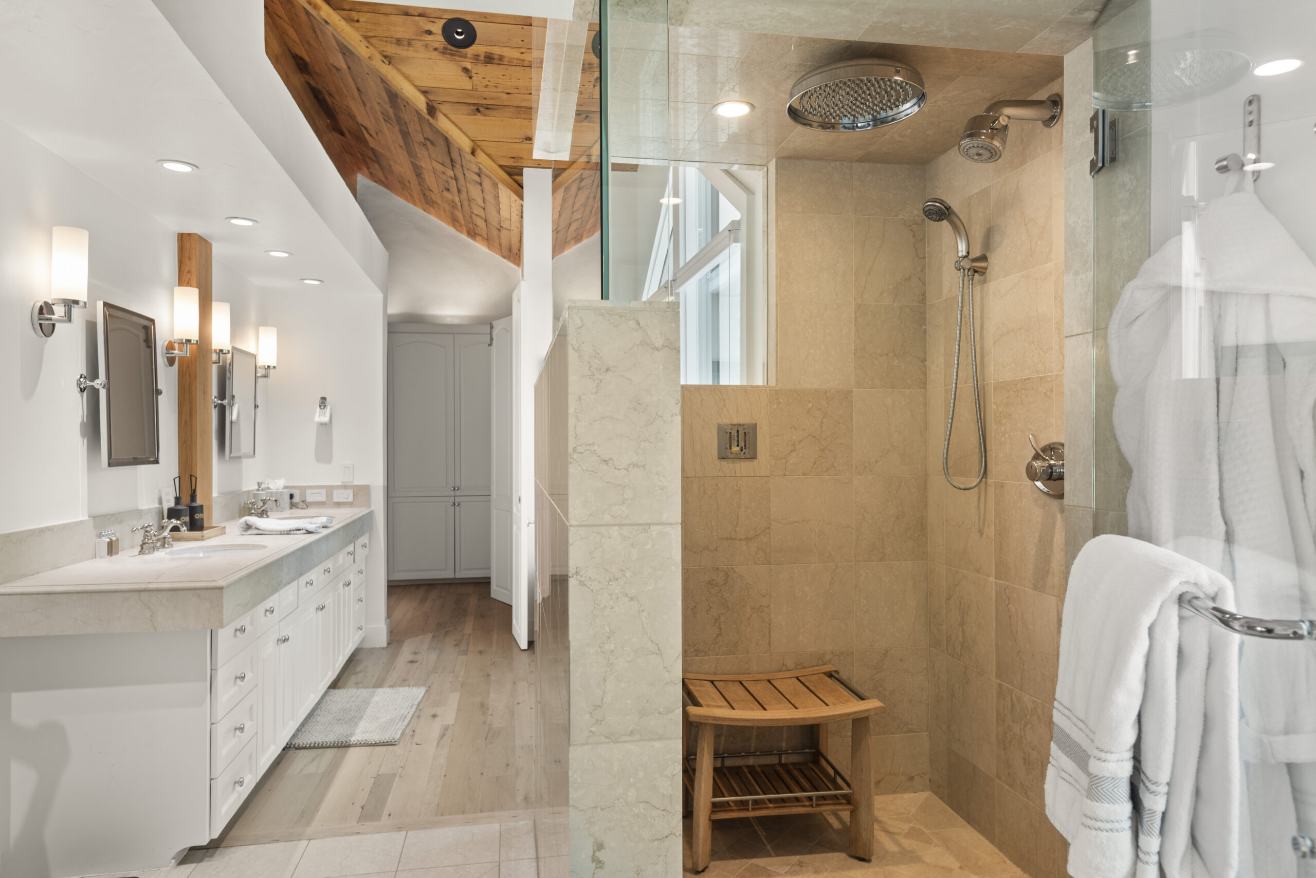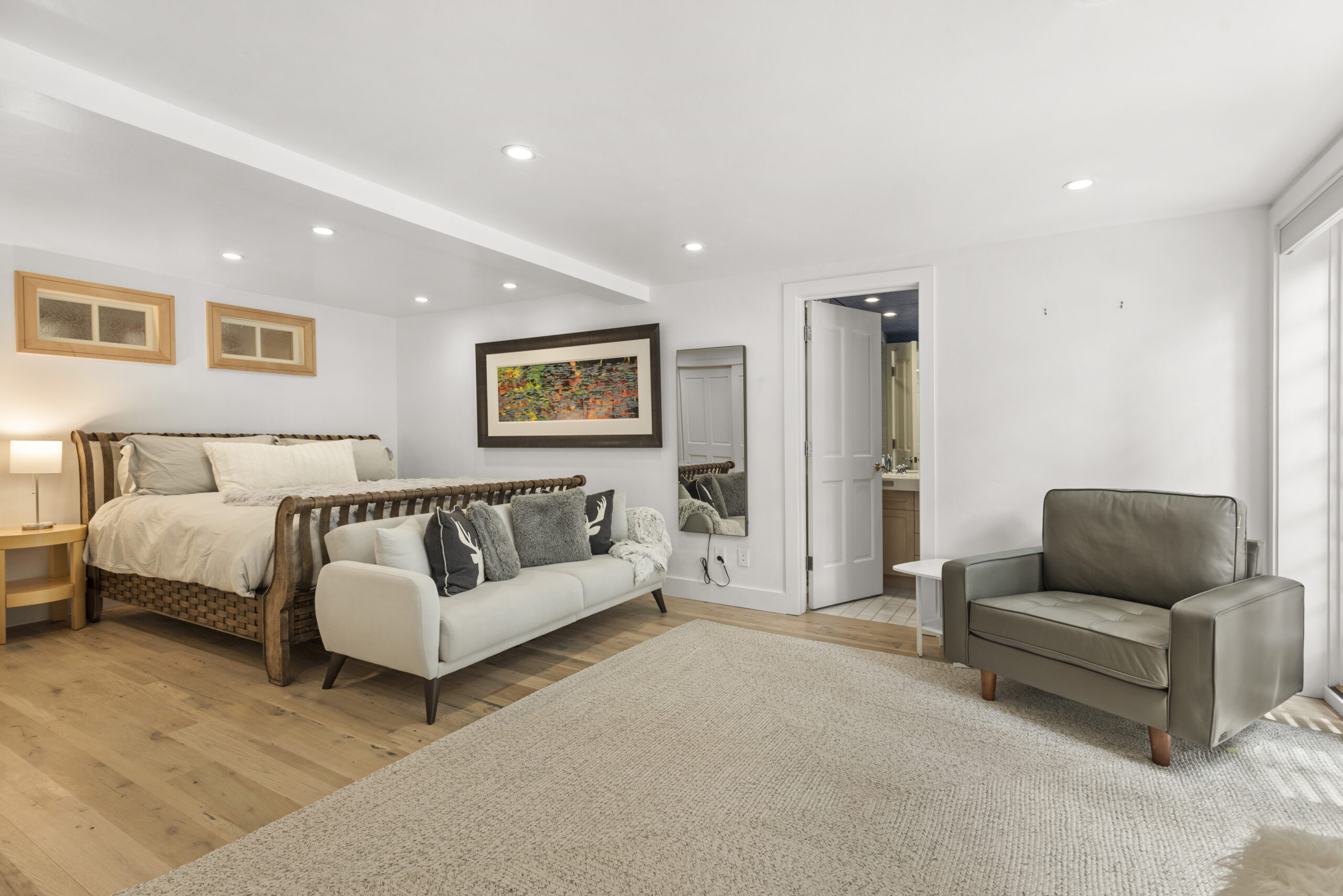 This newly renovated gem sits on a generous corner lot in Aspen’s coveted and tranquil West End neighborhood. Thoughtfully redesigned to embrace indoor-outdoor living, the light-filled main level features soaring vaulted timber ceilings, a wood-burning fireplace, and floor-to-ceiling slider doors that open to sun-drenched patios. The brand new gourmet kitchen includes Caesarstone countertops, custom cabinetry, and top-of-the-line appliances, seamlessly connecting to the open dining and living areas—ideal for entertaining and everyday comfort. Central A/C keeps the main level comfortable year-round, while expansive windows frame stunning views of Aspen and Shadow Mountain. The outdoor spaces are truly remarkable, with multiple gathering areas, a large patio for dining and grilling, a fire pit, and a recirculating stream set among mature Aspen trees and vibrant perennial gardens. The home’s southern exposure ensures sunshine throughout the day, a rare advantage in the West End. Just a few steps above the main living area, the elevated primary suite enjoys privacy and views of the landscaped patio below. It includes a gas fireplace, its own sunny balcony, and a luxurious spa-style bathroom with a jetted soaking tub, walk-in shower, and dual marble vanities surrounded by wraparound windows. Unlike most homes in the area, this residence is entirely above grade, allowing even the lower-level guest suites to enjoy garden views and direct access to the backyard and hot tub. Additional features include generous owner storage, cedar-lined closets, a large crawlspace, and a beautifully appointed main-level office with floor-to-ceiling windows facing the quiet corner lot. This special property also offers a private bike path out front, preventing overflow parking from the nearby Music Tent and preserving the home’s peaceful atmosphere. The front yard is nourished all summer long by the flowing Salvation Ditch, enhancing the lush gardens. With potential to expand by adding a subterranean level and a unique alley configuration that allows for four additional parking spaces beyond the two-car garage, this rare West End offering combines timeless design, exceptional light, and future flexibility. A true Aspen treasure not to be missed.